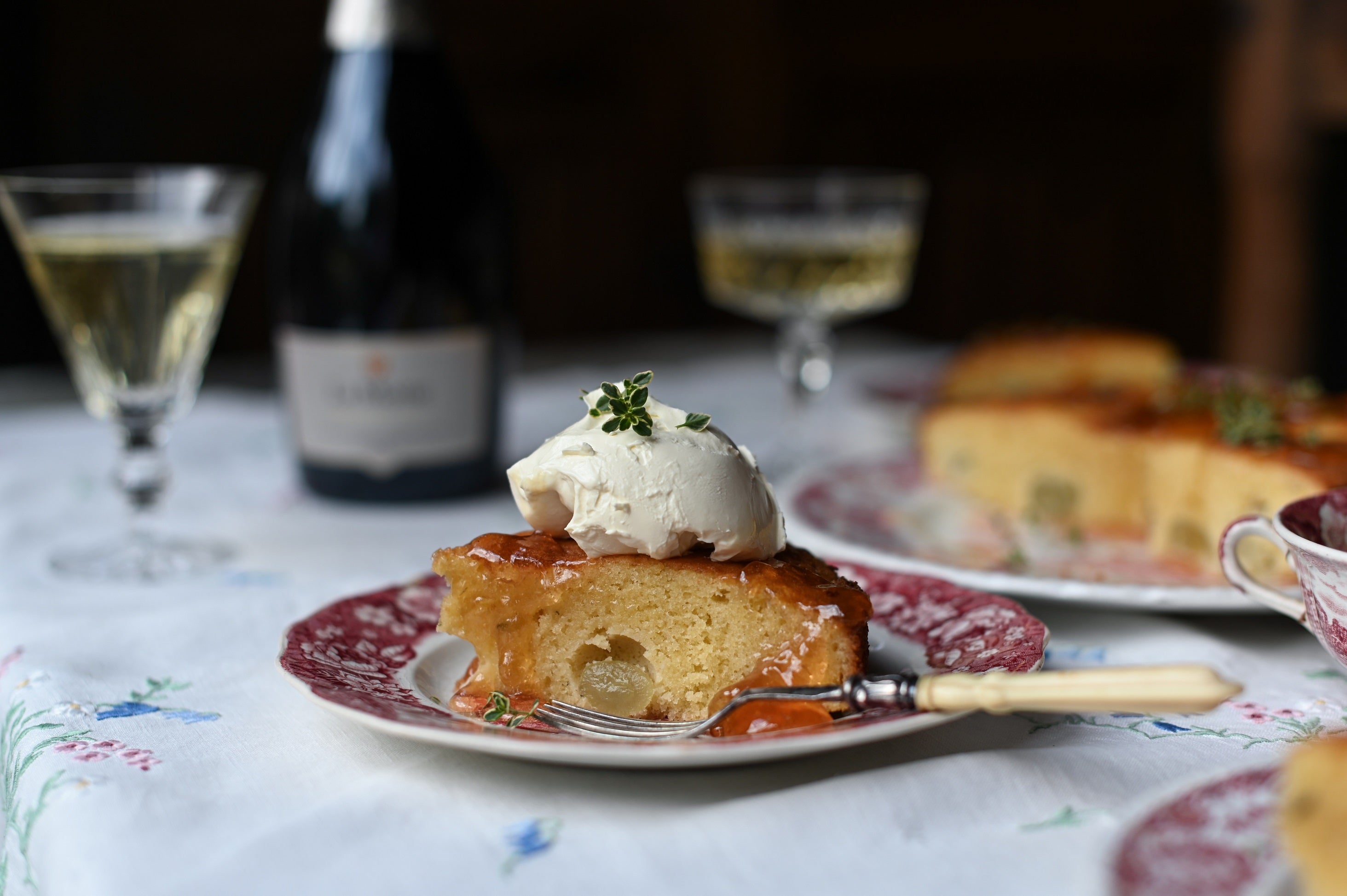 Before slicing, garnish the top of the cake with any leftover thyme leaves or flowers and serve the cake with some softened mascarpone or clotted cream. Any leftover grapes can be tossed in the remaining syrup and served alongside the cake with chilled glasses of La Motte’s 2018 Méthode Cap Classique.