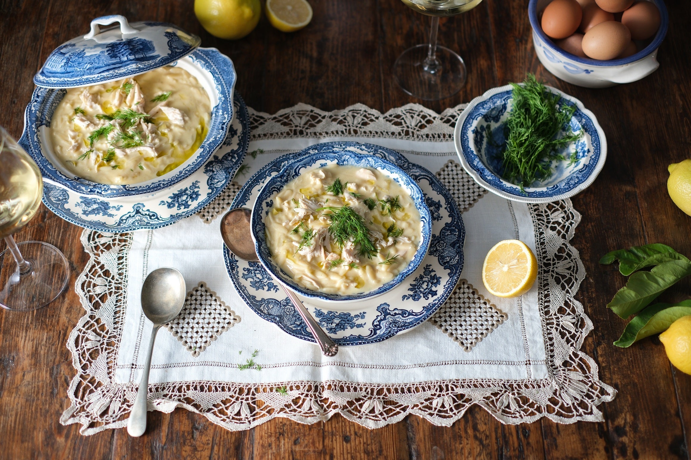 Creamy and comforting, Avgolemono is a traditional Greek soup flavoured with egg and lemon. This version uses orzo – pasta rice – and shredded chicken to further enrich the soup.
