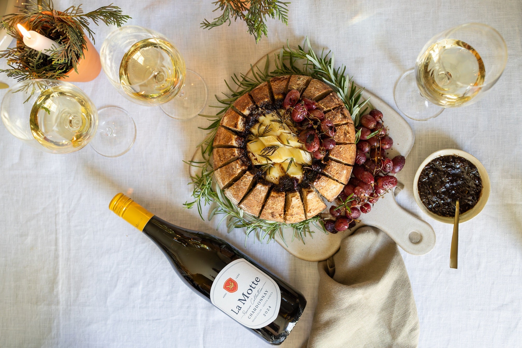 The creamy, buttery notes of La Motte Chardonnay pair perfectly with the savoury-sweet layers of this dish — from the nutty butter to the syrupy port reduction. The wine’s gentle oak complements the caramelised onions and grapes, while its crisp acidity cuts through the richness of the Brie. It’s the perfect pairing for a relaxed evening with friends, especially when served warm straight from the oven.