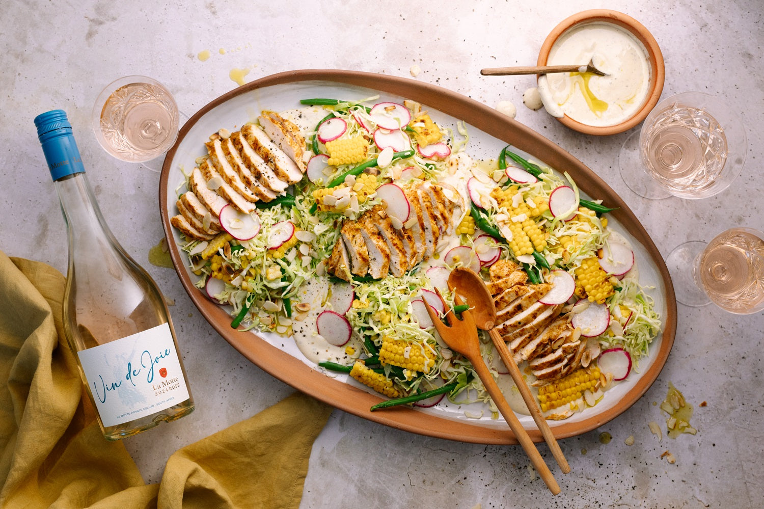 - Spoon the dressing onto a large serving plate – then top with the salad and lastly top with the chicken strips. Serve with lemon wedges on the side and some more toasted almonds