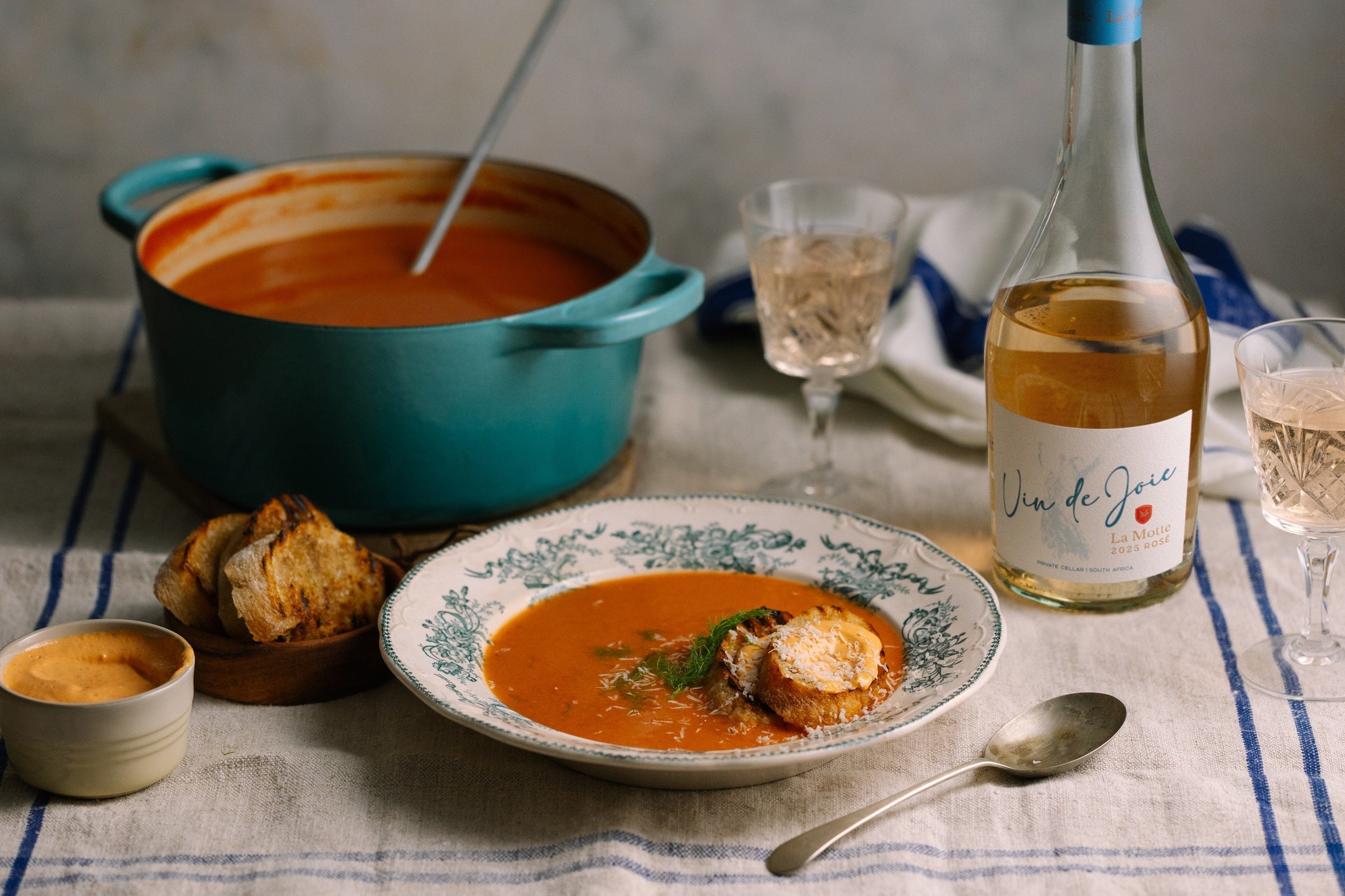If you are familiar with a classic French bouillabaisse, this soup is its cousin. Using fish only (no shellfish) to create a bisque-style fish soup with light and bright flavours of orange rind, fennel and tomato, it is essential to serve it with toasted baguette croutons smeared with a rich red pepper rouille. A dash of Pernod is considered traditional for that quintessential anise flavour, but in South African style you can also add a dash of brandy, just remember to serve with a generous glass of the 2025 Vin de Joie Rosé!