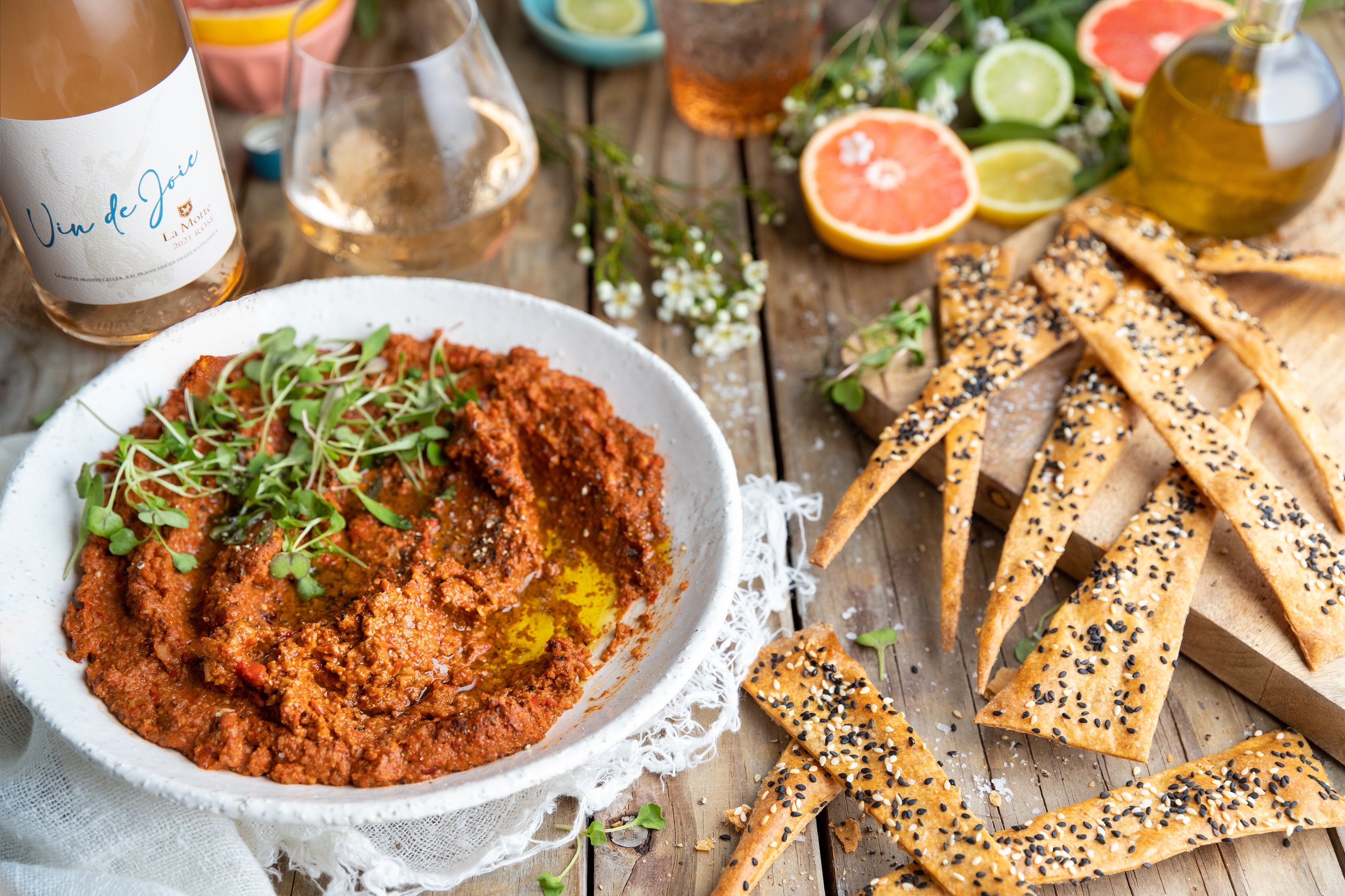 Swirl the muhammara in a low-rimmed serving dish. Drizzle with olive oil and a grind of black pepper, top with microgreens and serve with lavash crackers for scooping.