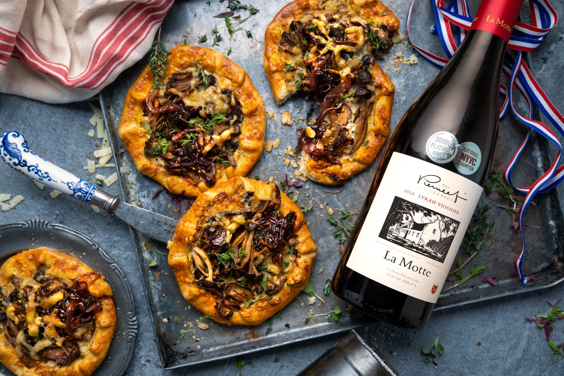 To assemble the galettes, spoon the ricotta mixture evenly onto the centre of each pastry. Top with the mushroom mixture, then add spoonfuls of the caramelised onions. Sprinkle grated Gruyère over each galette and garnish with a sprig of thyme.