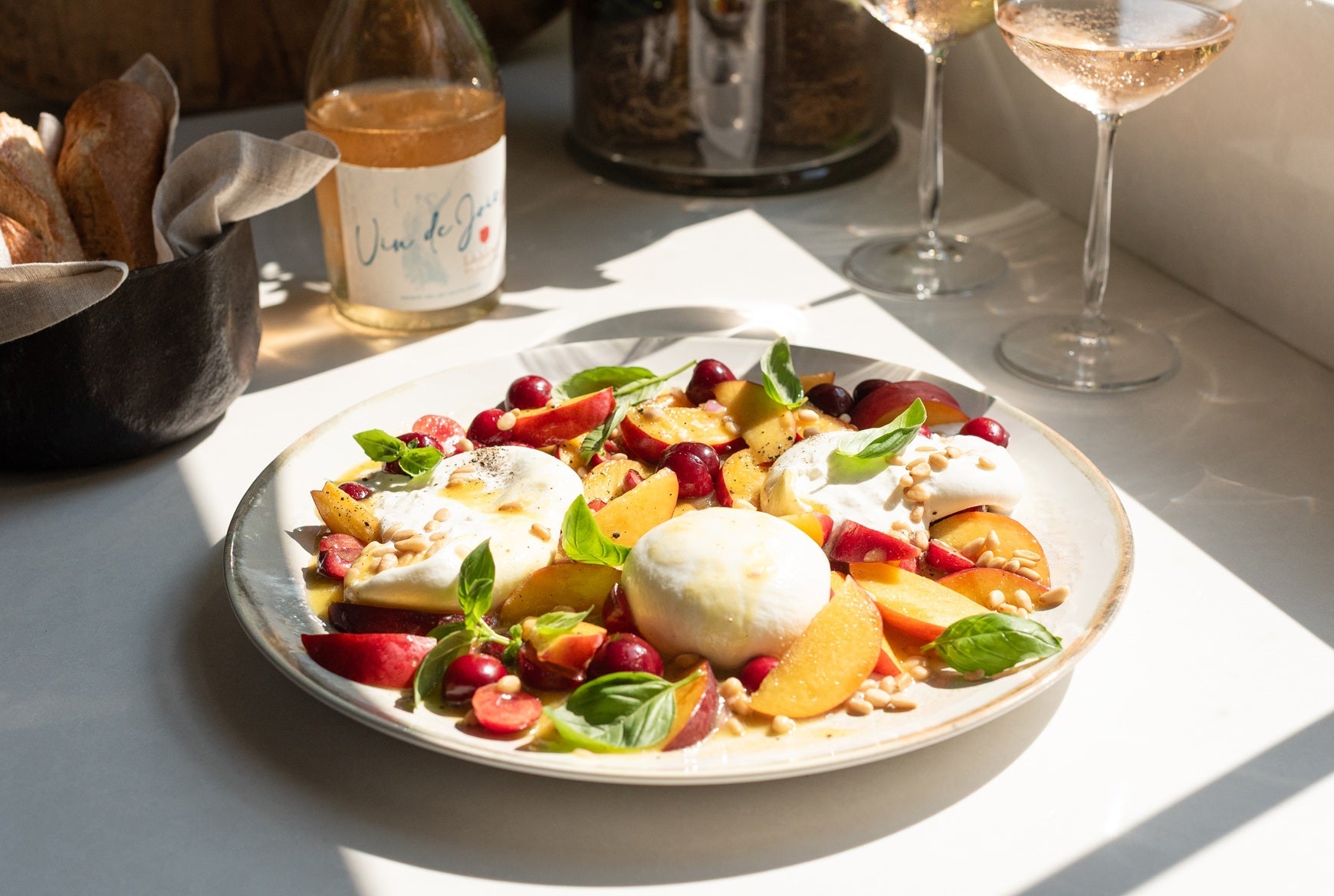 Drain the water off the burrata and nestle between the nectarines and cherries. Drizzle over the dressing and finish with basil and pine nuts.