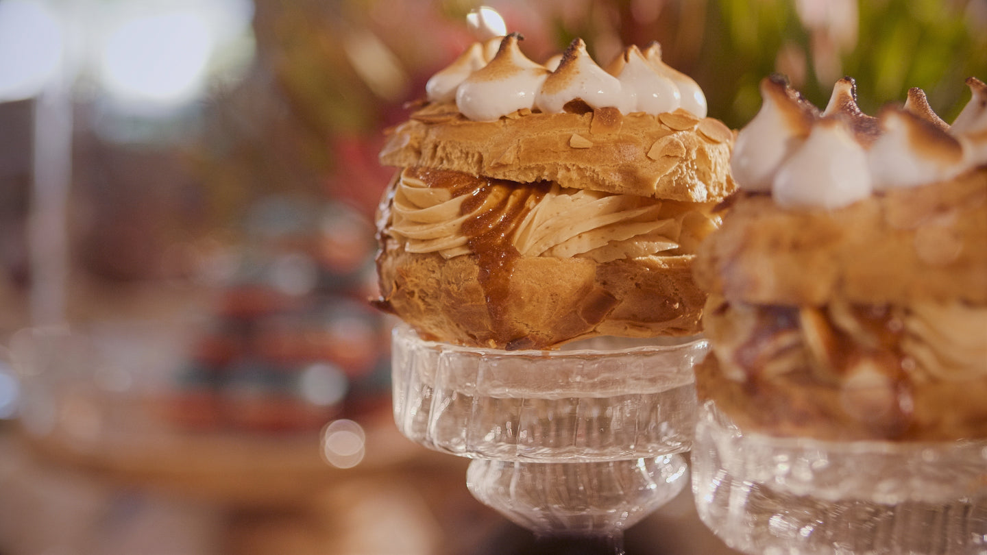 Cut the paris-brest in half, lengthways. Pipe the praline filling in a circular motion around the base of the pastry. Keep in mind it should be visible once the lid of the Paris-Brest is placed on top. Drizzle the filling with more praline paste before placing the lid of the Paris Brest lightly on top. Dust the filled Paris-Brest generously with icing sugar.