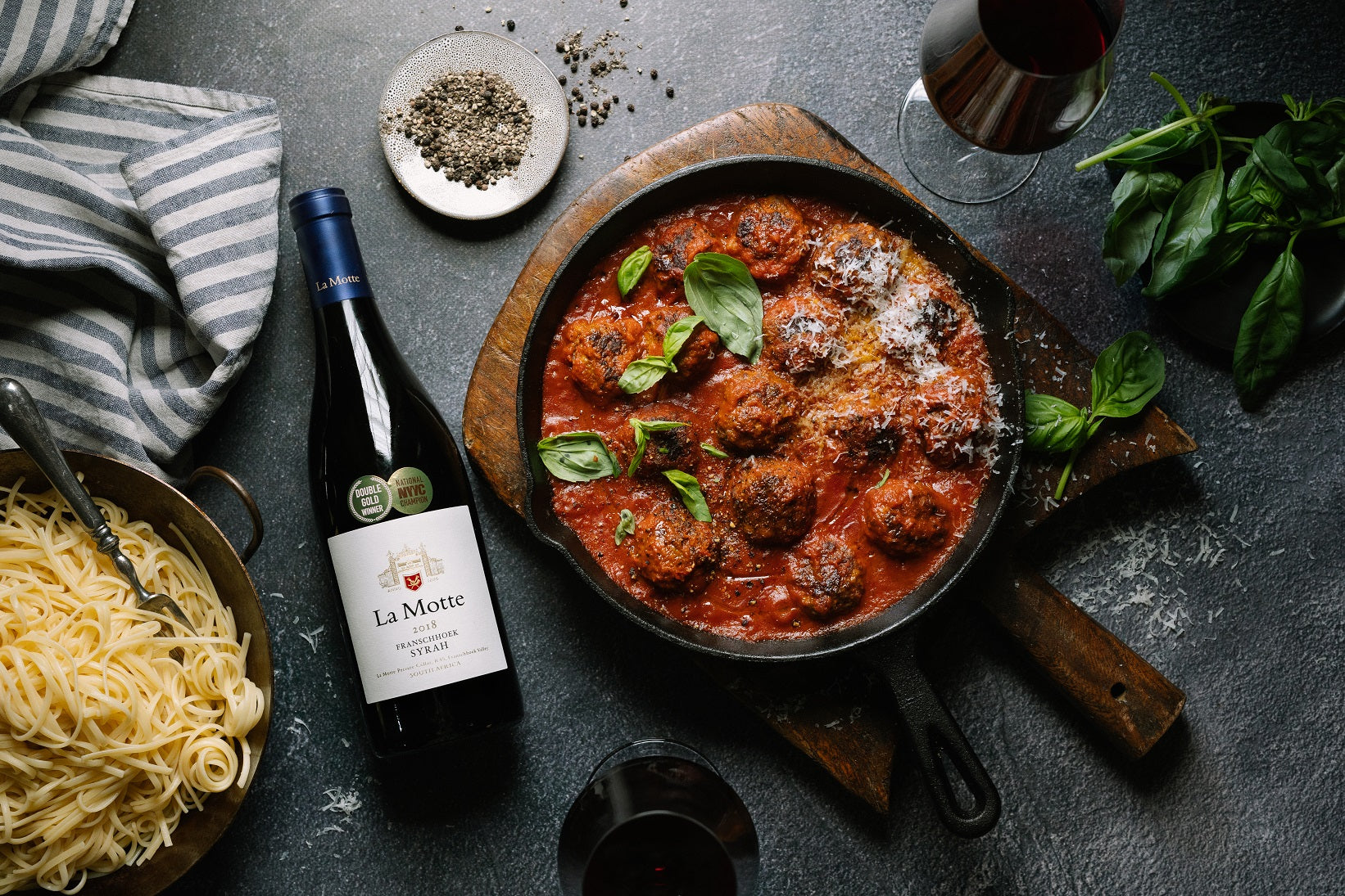 "There are few things that beat the sight and smell of hearty meatballs in a thick sauce. Served with freshly cooked pasta and parmesan cheese, its comfort food that dreams are made of. These beef meatballs are made with lots of black pepper and are smothered in a bright punchy sauce made with canned tomatoes, red pepper and smoked paprika. Serve with your favourite type of pasta - any shape will do!" Definitely serve with generous glasses of 2019 La Motte Syrah.