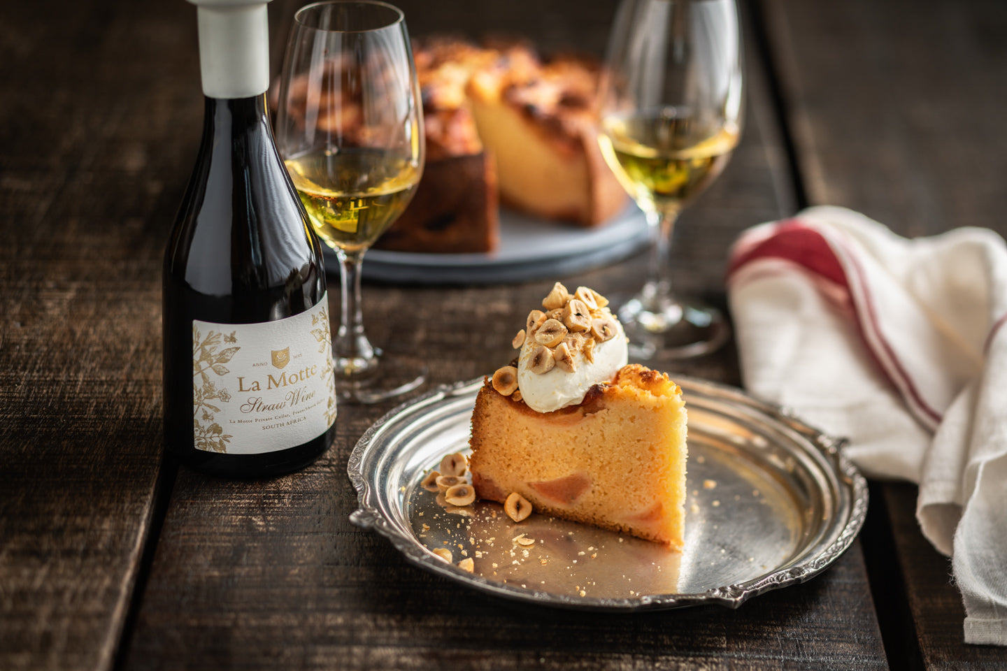 Serve the cake warm with a dollop of vanilla crème fraiche on top, a little honey drizzled over, chopped roasted hazelnuts - and most importantly, a glass of La Motte Straw Wine!