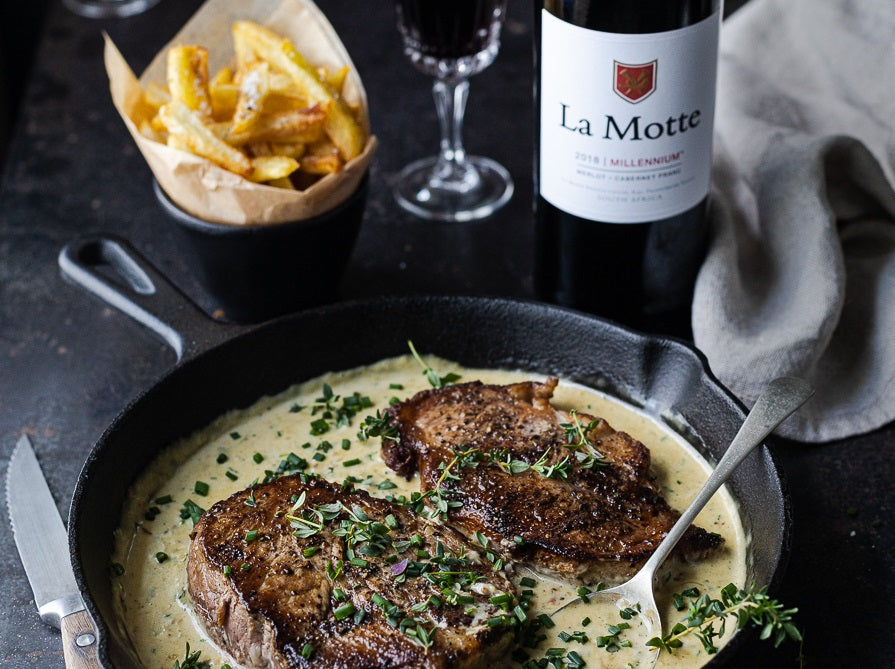 If you want to make some of this ahead, start by blanching the sliced fries and set them aside to cool. Chop your shallots, garlic and herbs and set aside. The rest can be done straight before serving and only takes about 10-15 minutes. Serve with La Motte’s Millennium red blend. Bon appétit!
