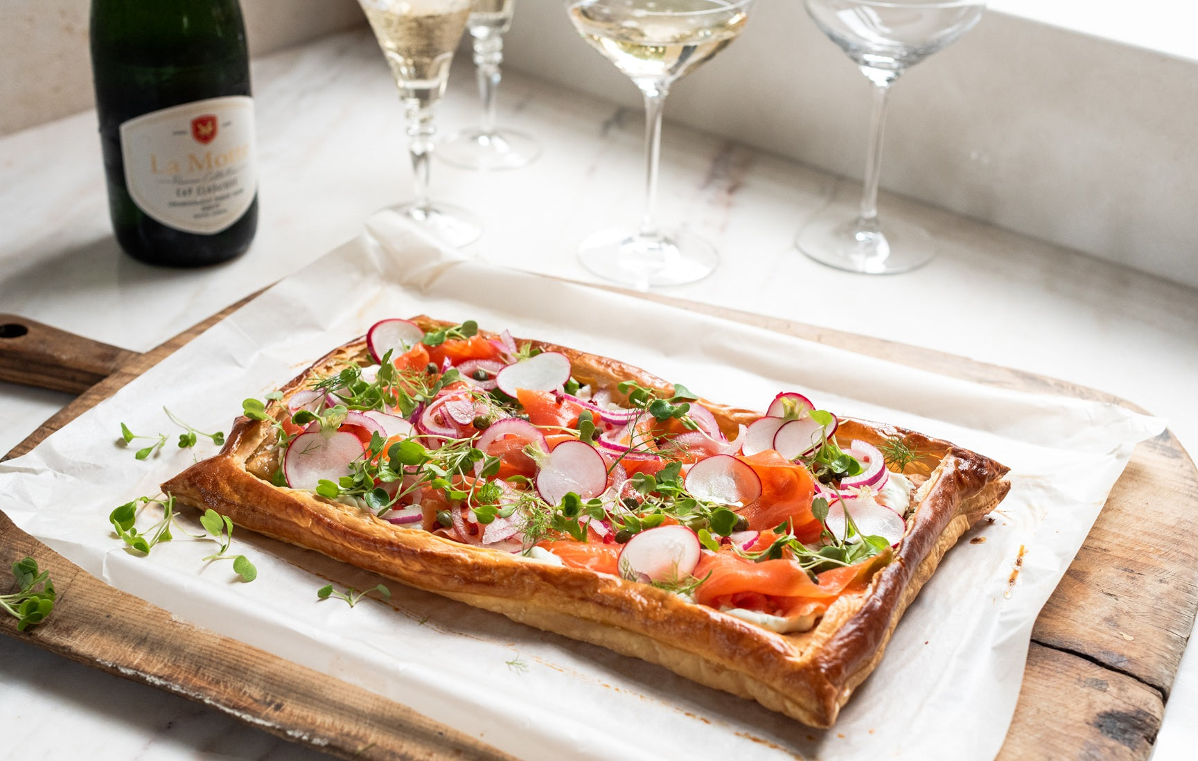 Allow the pastry to cool for 10 minutes before spreading the filling into the hollowed base. Top with trout ribbons, capers, micro herbs and radishes.