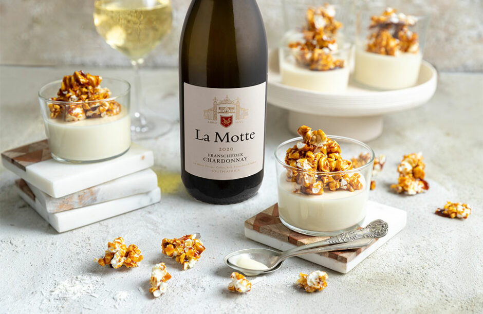 When ready to serve, remove the mousses from the fridge and top with pieces of crunchy caramel popcorn. Serve with a beautiful glass of 2022 La Motte Chardonnay.