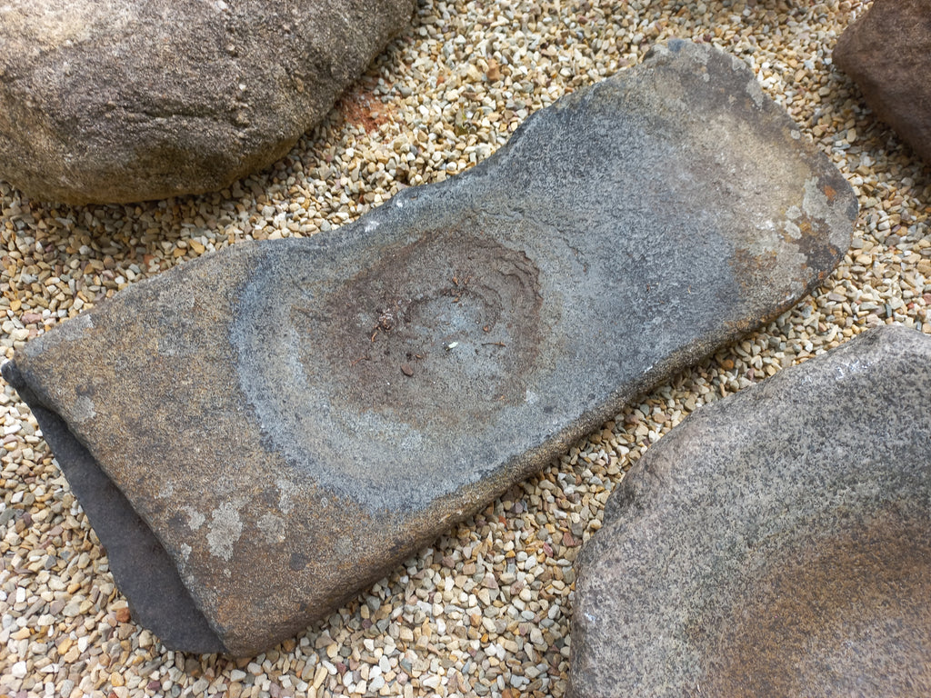 Gradually, the upper quernstone became larger and was consequently pushed forwards and pulled backwards. The saddle quern appears in Mesopotamian and Egyptian references and is mentioned in Exodus. Saddle-querns found in South Africa today are similar to Egyptian references from more than 4 000 years ago. The upper quernstone side for grinding is a heavy dolerite slab, with an upper face either flat or slightly convex, and a lower grinding face which is almost flat or slightly rounded when new. Through constant use and pecking to roughen the finding face, it assumes a convex shape. The lower quernstone is also made of dolerite and is larger, and the grinding surface is a well-defined concavity, pecked out with a quern pecker. The woman who is grinding kneels behind the quern and feeds grain into the stone. This she grinds by pushing it over the lower edge of the quern into a loosely woven reed mat placed on the ground at the foot of the quern. The rubbing face of the saddle-quern is steeper in the front than in the rear, and the slight right movement down the stone resulted in a minor angle of the convex rubbing stone as well as on the long axis of the rubber itself.