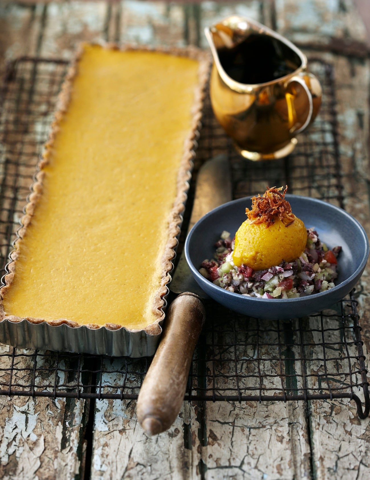 The tart can be served with cinnamon buttered roast pumpkin and citrus peel.