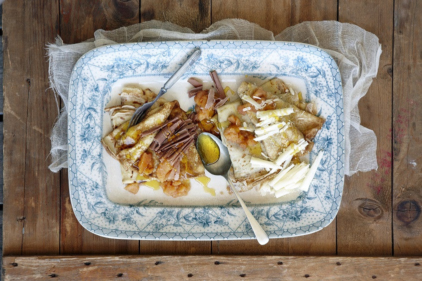 Roll up or fold into triangles and serve with slices of lemon and cinnamon sugar, or with Van der Hum Sauce and chocolate curls.