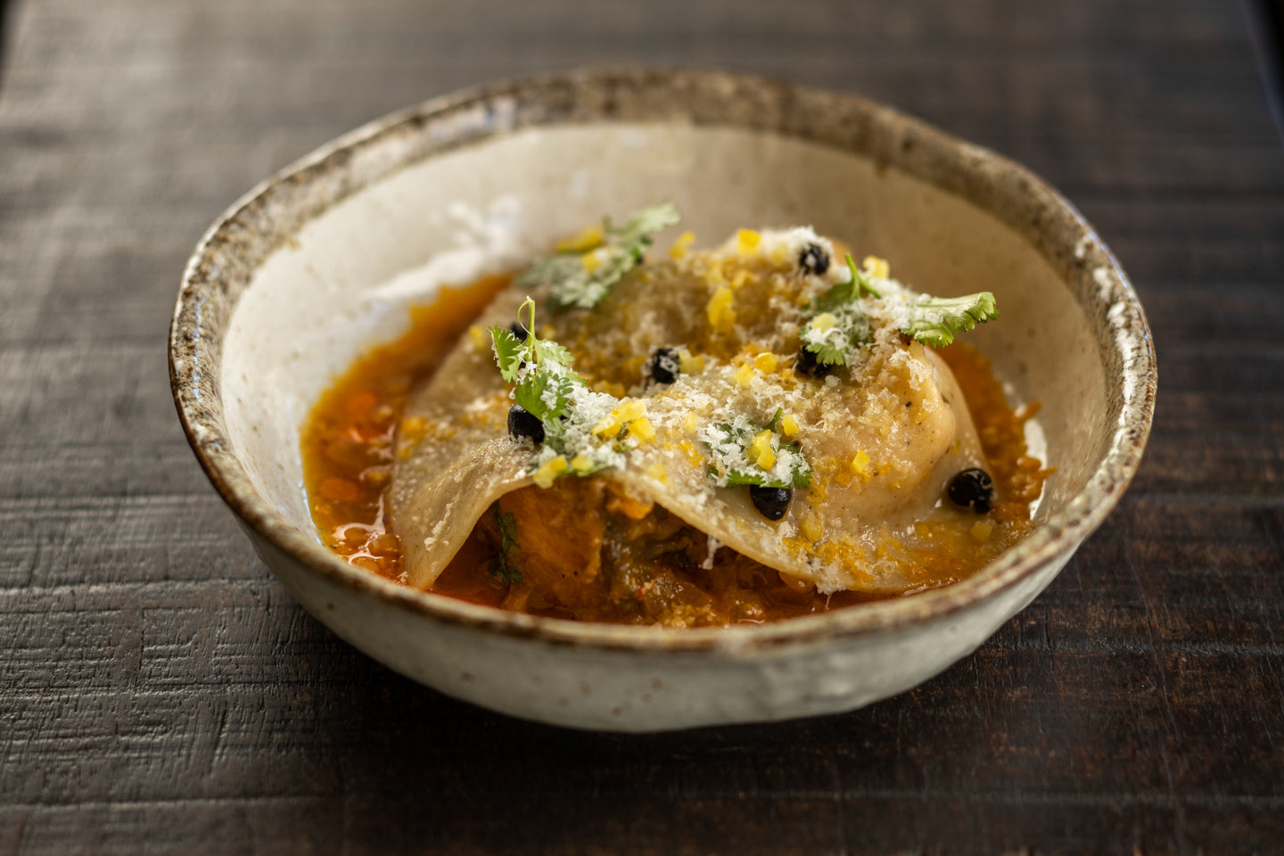 In a small bowl dish some of your curry, drape over a lasagne sheet, garnish with the fennel tops, parsley, crumbled goats’ cheese and preserve lemon. Pour over a little masala oil to finish.