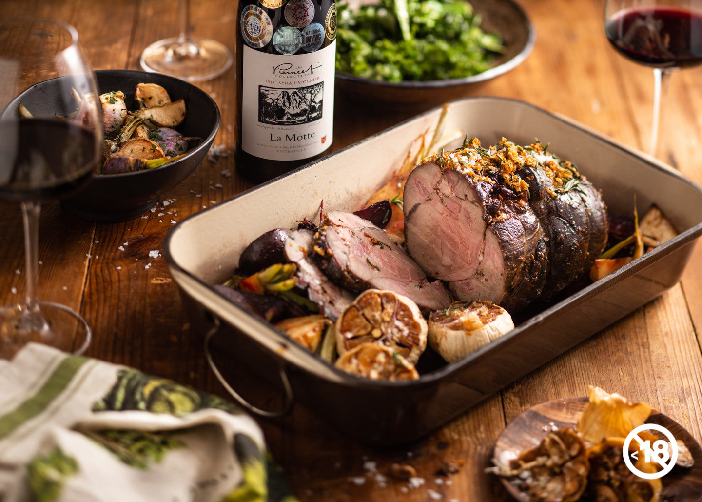 Carve the springbok leg and dish up with the trimmings. Serve with your choice of 2017 La Motte Syrah or 2017 Pierneef Syrah Viognier.