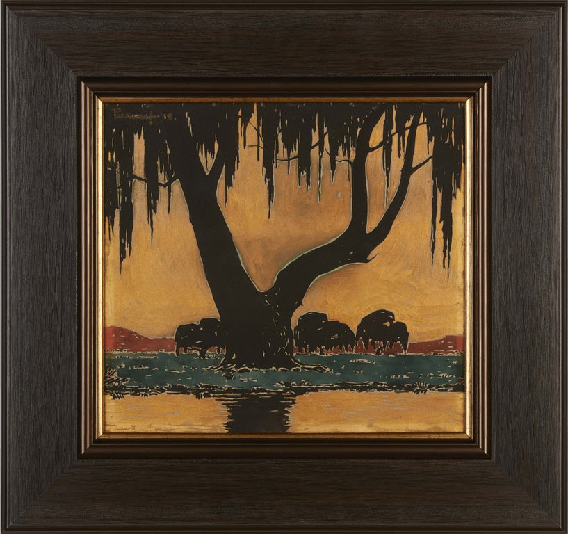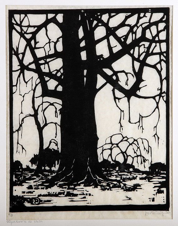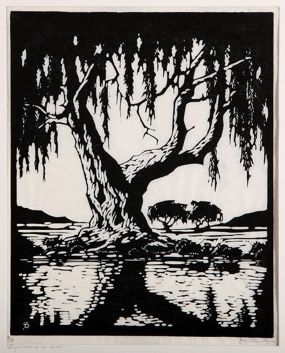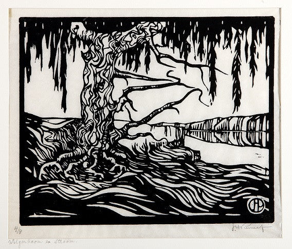 Pierneef studied the willow at various times of the day and year. He made an in-depth study of the colours, shadows and pattern of the trunk and branches, especially in winter. In his linocuts, Pierneef used the willow’s hanging or weeping branches and leaves as a complementary silhouette in compositions, almost serving as a decorative frame for the picture. Apart from in linocuts, the willow also appears in a number of watercolours and specifically oil-paintings.