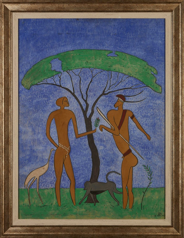 As for Adam and Eve (1925), Pierneef can be credited only for the composition and minor changes made to ‘complete’ each element. Adam, Eve and the baboon are copies from Stow’s tracings; the crane is a copy of Tongue’s, and the tree comes from Peters, even though resembling the Pierneef canopy. It was, therefore, a fascination with and an interest in the formal aspects and simplicity of this indigenous art form that captured Pierneef’s imagination and further inspired his pursuit of creating a uniquely South African style of art.