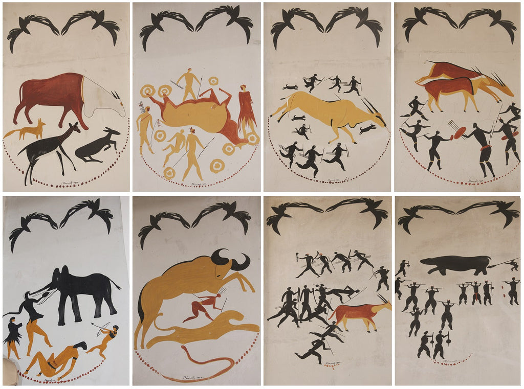 Upon delivering his first lecture on indigenous art to members of Onze Taal, in Bloemfontein in 1917, Pierneef befriended Reenen J van Reenen. Through Van Reenen, Pierneef received his first large public commission, in 1922 – to decorate the new school hall of Ficksburg High School (today the SH Pellisier Gallery) with the motifs of San rock paintings. There were eight panels in total, each measuring 1,2 m x 2,9 m, and a frieze just below the ceiling, extending right around the hall. Pierneef relied on the tracings of Stow, Tongue and Van Reenen as ‘primary’ sources. Therefore, each panel is a composition of various tracings and sites (just as Stow and Tongue had done with their drawings). The various motifs, having been rearranged and combined, ended up being far removed and detached from their original symbolic meaning (as portrayed in the original rock painting) and can, therefore, be regarded as no more than decorative.